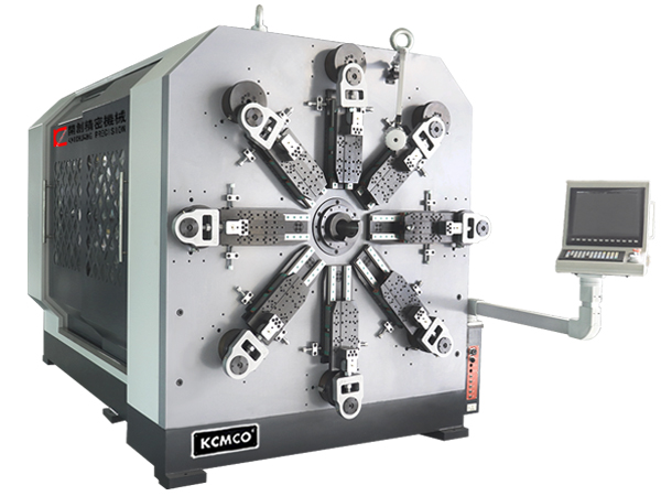 開創KCT-1280WZ十二軸數控萬能彈簧成型機引用臺灣電腦Windows7控制系統和日本進口安川伺服電機,采用獨特的無凸輪和無搖臂設計,刀架由八組伺服馬達獨立控制,其中刀架八軸、送線一軸、轉芯一軸、轉線一軸和卷曲一軸,其統成由曲柄連桿成形系統、送線和轉線系統、繞線校直系統及轉芯系統等組成。此外,該機型可配帶液壓剪刀裝置,切割噪音小,對芯棒及機器的損害為零;同時也極大的提升了彈簧加工范圍,不僅具有成形快、精度準和性能穩等特點,而且調機更方便,易操作。